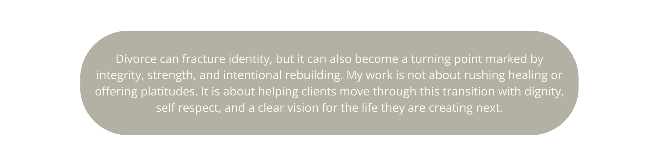 Alongside my executive career, I have spent years supporting women in moments of profound personal rupture. Divorce is not simply a legal event. It is a psychological, emotional, and existential transition. For many high net worth and high visibility individuals, it unfolds under layers of pressure that few truly understand. Public scrutiny, complex financial structures, legacy concerns, and family systems intensify grief while demanding composure and strategic thinking.